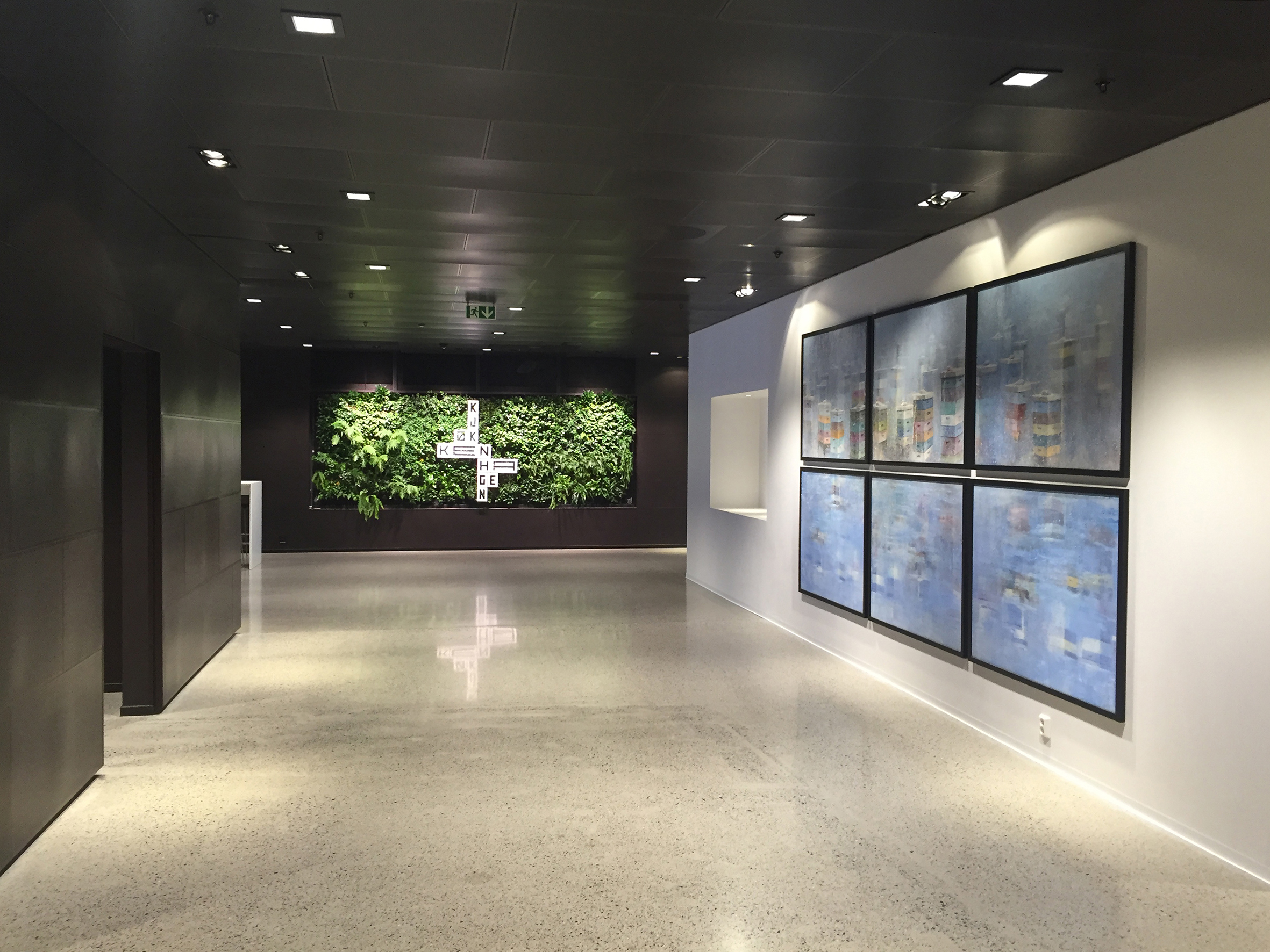 Our mission was to relate the art to the buildings character. The cafeteria entrance and foyer walls are now decorated with several custom works by the Norwegian painter Frank Brunner, and his series depicting colorful bee cubes in various forms.The bee cubes are a direct reference to the buildings very own rooftop honeyproducing bees.
