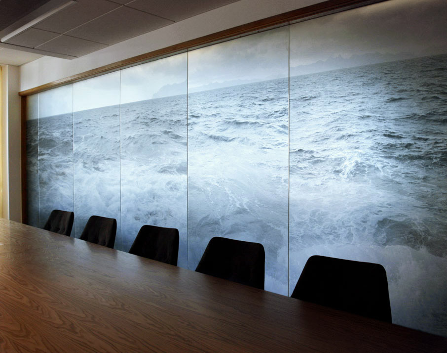 The glass installation explores the interplay between image, light, and movement. Installed at the Leif Høegh & Co headquarters in Oslo, the work comprises ten glass walls, nine framing meeting rooms and one featuring grass imagery in the cafeteria.