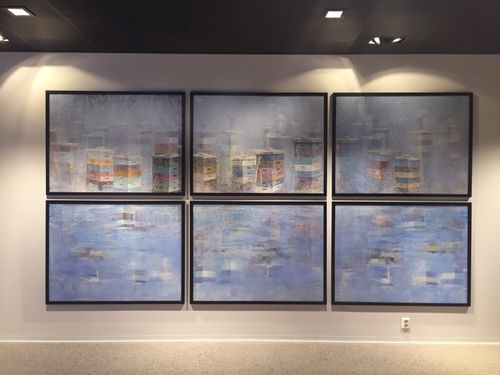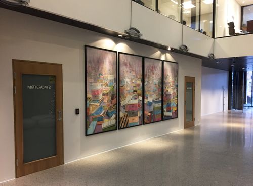 Our mission was to relate the art to the buildings character. The cafeteria entrance and foyer walls are now decorated with several custom works by the Norwegian painter Frank Brunner, and his series depicting colorful bee cubes in various forms.The bee cubes are a direct reference to the buildings very own rooftop honeyproducing bees.